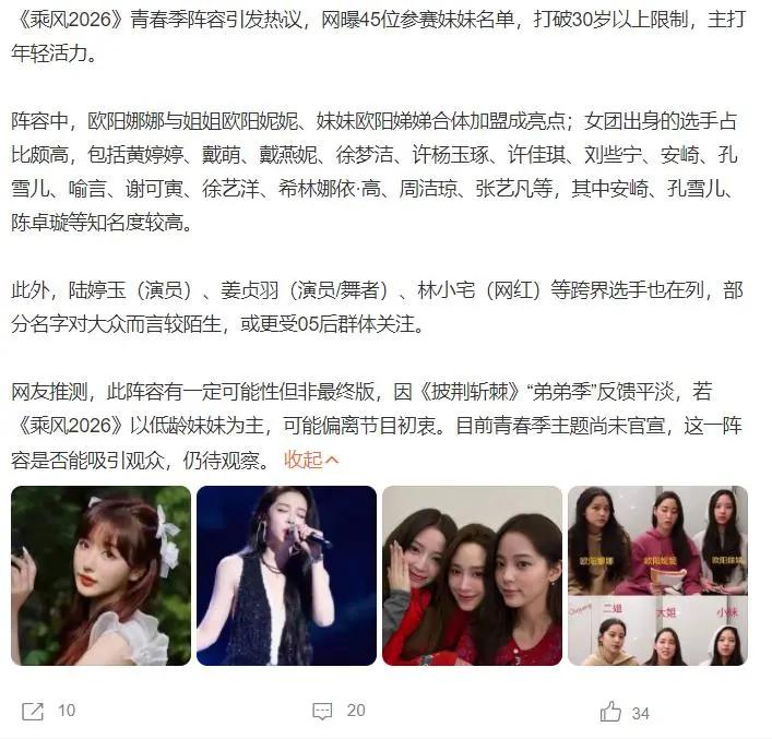 《乘风2026》将阻拦30+年岁死心,邀请更多有活力的姐姐参与录制,然后网上还传出录制声势名单,在这份名单中,咱们不错发现,大部分姐姐齐是女团建立,热度较高的有:欧阳娜娜、孔雪儿、安崎、徐梦洁、希林娜依·高、周洁琼、徐艺洋、谢可寅、喻言等东说念主。